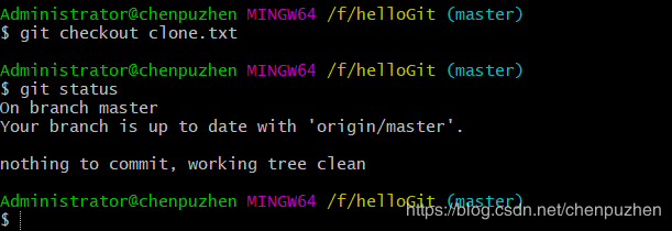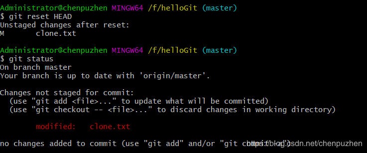 還有個命令提示:git checkout --<file> to discard changes in working directory這個意思就是下載某某文件,丟棄掉該文件在工作區的改變內容。姑且就這么翻譯吧。就是把文件還原了,工作區的修改也沒了。我們執行該命令查看狀態,如圖: