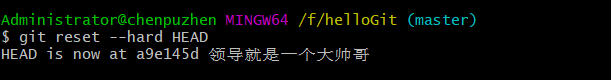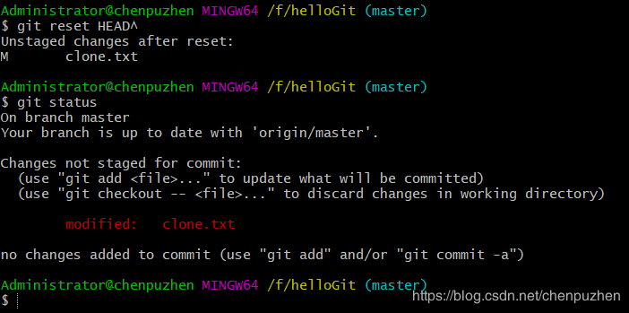 這時我們發現添加了錯誤的內容,此時我們只是做了add 操作,就是將修改了內容添加到了暫存區,還沒有執行commit,所以還沒有生成版本號,當前的版本號對應的內容,還是你add之前的內容,所以我們只需要將代碼回退到當前版本就行。