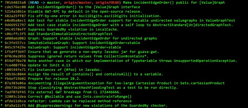 # 指定文件夾 loggit log --pretty=format:"%h %cn %s %cd" --author="iisheng/|勝哥" --date=short src# 查看指定用戶指定format 提交 git log --pretty=format:"%h %cn %s %cd" --author=iisheng --date=short # 查看該文件的改動歷史git log --pretty=oneline file# 圖形化查看歷史提交git log --graph --pretty=oneline --abbrev-commit# 統計倉庫提交排名前5git log --pretty='%aN' | sort | uniq -c | sort -k1 -n -r | head -n 5# 查看指定用戶添加代碼行數,和刪除代碼行數git log --author="iisheng" --pretty=tformat: --numstat | awk '{ add += $1 ; subs += $2 } END { printf "added lines: %s removed lines : %s /n",add,subs }'git rebase