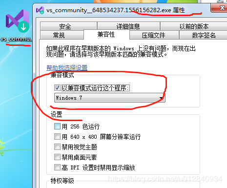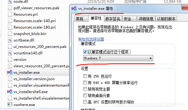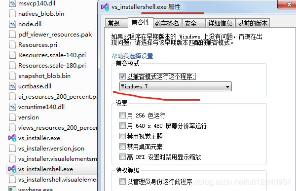 第一步:進入C:/Program Files (x86)/Microsoft Visual Studio/Installer中,找到vs_installer.exe 和 vs_installershell.exe,并分別改變他們的兼容模式,具體如下: