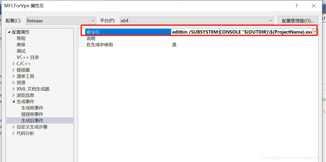 配置屬性->生成事件->生成后事件->命令行 加入: