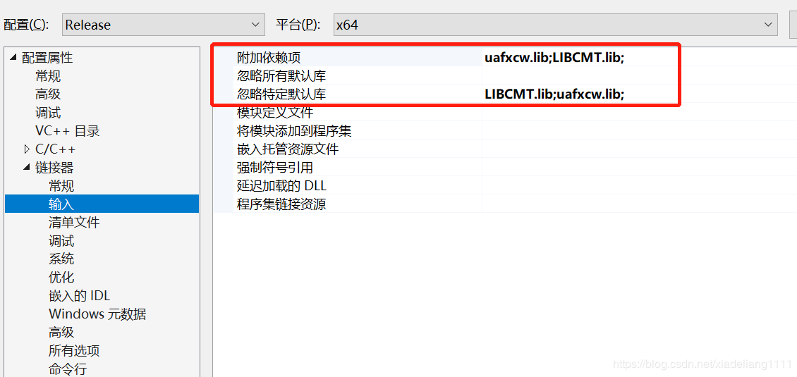 項目->屬性->鏈接器->輸入->附加依賴項添加:uafxcw.lib;LIBCMT.lib