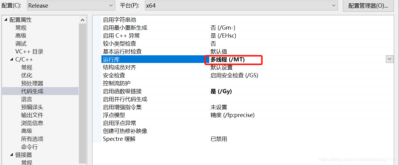 項目->屬性->C/C++->代碼生成->運行庫需要改成多線程(/MT)