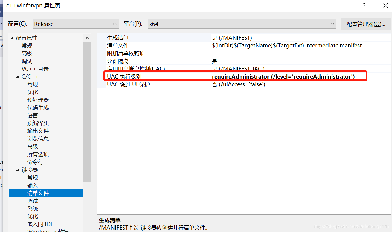 屬性->鏈接器->清單文件->UAC執行級別