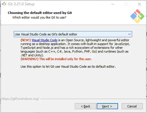 第四步:選擇默認(rèn)編輯器,我日常使用Vscode作為編輯器,勾選使用 Visual Studio Code 作為 Git 的默認(rèn)編輯器,點(diǎn)擊[next]