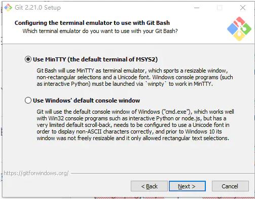 選項(xiàng)一,Git Bash將使用MinTTY作為終端模擬器,該模擬器具有可調(diào)整大小的窗口,非矩形選區(qū)和Unicode字體