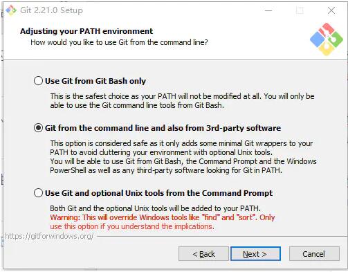 選項(xiàng)三,會(huì)將git相關(guān)程序以及一些其他的Unix工具加入系統(tǒng)環(huán)境變量,使得Windows系統(tǒng)cmd命令行中可以使用git以及Unix工具。要注意的是,這將覆蓋Windows工具,如 “ find 和 sort ”。只有在了解其含義后才使用此選項(xiàng)。