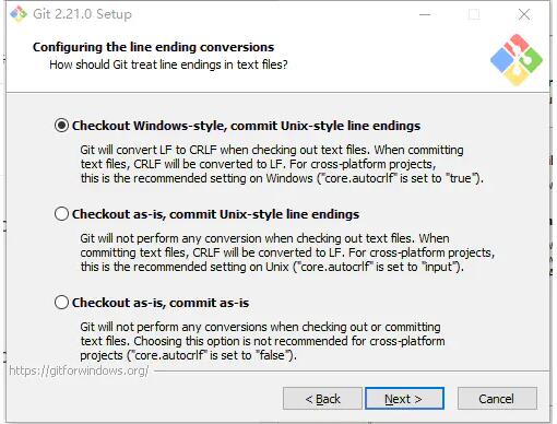 選項(xiàng)一,選項(xiàng)讓Git能夠自動(dòng)轉(zhuǎn)換文件中的換行符;簽出到本地時(shí)轉(zhuǎn)換為Windows下的換行符,提交到服務(wù)器時(shí)轉(zhuǎn)換為Unix下的換行符