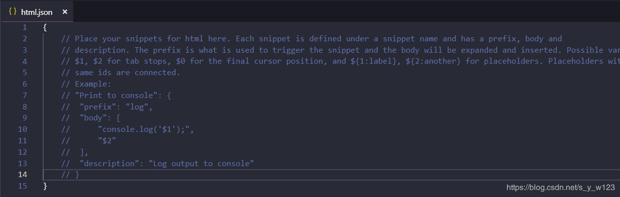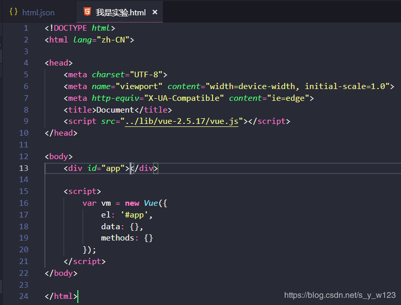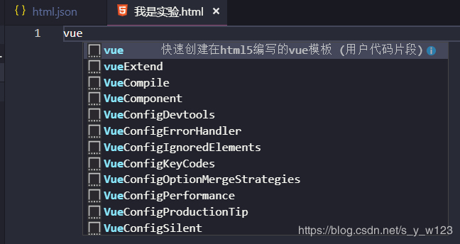"Html5-Vue": { "prefix": "vue", "body": [ "<!DOCTYPE html>", "<html lang=/"zh-CN/">/n", "<head>", "/t<meta charset=/"UTF-8/">", "/t<meta name=/"viewport/" content=/"width=device-width, initial-scale=1.0/">", "/t<meta http-equiv=/"X-UA-Compatible/" content=/"ie=edge/">", "/t<title>Document</title>", "/t<script src=/"../lib/vue-2.5.17/vue.js/"></script>", "</head>/n", "<body>", "/t<div id=/"app/">$1</div>/n", "/t<script>", "/t/tvar vm = new Vue({", "/t/t/tel: '#app',", "/t/t/tdata: {},", "/t/t/tmethods: {}", "/t/t});", "/t</script>", "</body>/n", "</html>" ], "description": "快速創建在html5編寫的vue模板"}把上面的這個模板拷貝到html.json中即可,當然路徑要變成自己的本機路徑,其余的地方如果看著不舒服也可以自行更改。