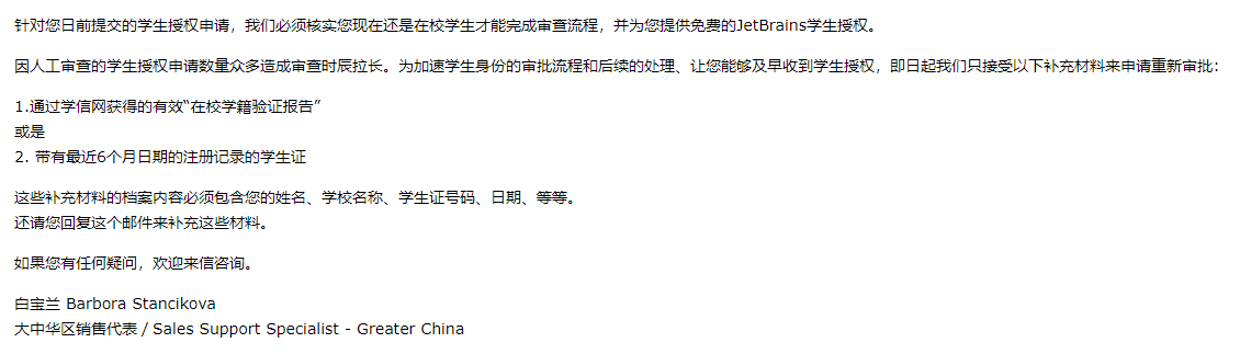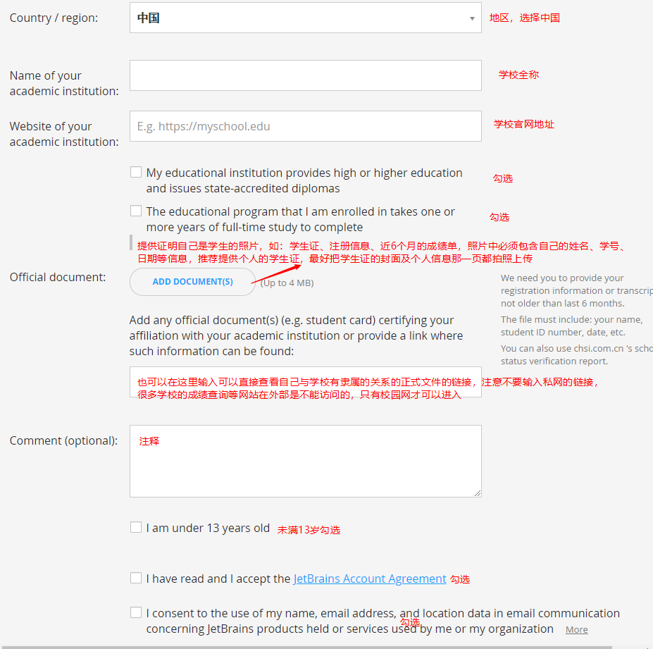 根據圖片中的注釋完成學生認證的申請既可以,注意學生證的照片要拍清晰,可以上傳不止一張照片。填寫的電子郵箱也將是以后JetBrains的賬號。