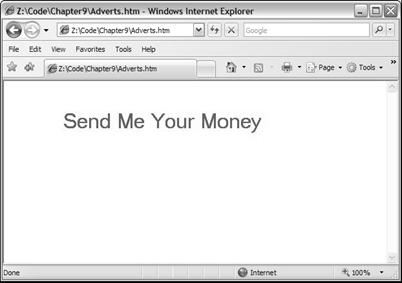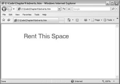 在編輯器中輸入上面的代碼,并保存為adverts.htm文件。另外,我們還需要創建三個圖形文件:advertimage1.jpg、advertimage2.jpg和advertimage3.jpg文件(或者,也可以從本書的代碼下載中獲得這三個文件)。當頁面被加載時,開始時將看到一個advertimage1.jpg圖片,如圖9-5所示。