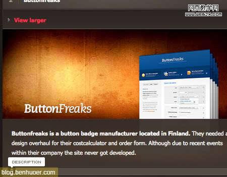 marius roosendaal (www.mariusroosendaal.com)使用另一個非常漂亮的滑動導(dǎo)航菜單來“儲藏”他的作品圖像。與上面例子一樣,每一個內(nèi)容區(qū)塊都是一個項目的展示。不過,此例的滑動導(dǎo)航菜單里的每個圖像還附加有一些文字介紹。你能注意到一個小按鈕被用來顯示/隱藏介紹。他同時也提供到更詳細(xì)介紹或者更大預(yù)覽圖的鏈接。在一個小小的滑動導(dǎo)航菜單里當(dāng)然不能塞進(jìn)特別特別多的信息,所以如果可以的話,還是盡量給每個項目都加上到詳細(xì)內(nèi)容的鏈接吧。