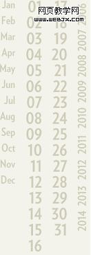其實現過程已有chris coyier 在《date display technique with sprites》一文中作了詳細介紹,這里把其實現過程作一個簡單的描述。很顯然,我們不希望每一個日期用一張單獨的圖片,因此,將其整合到一張圖片之上,安排年、月、日在圖片的不同區域,如圖: