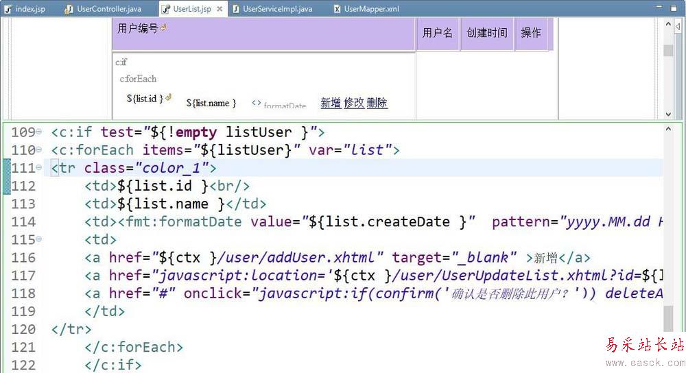 2、前臺建立UserList.jsp文件,將后臺listuser顯示到前臺,代碼如下圖所示。