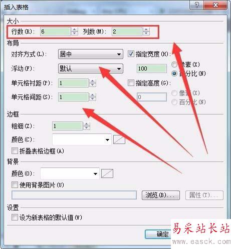 3、設(shè)置好表格的行列數(shù),對(duì)齊方式為居中,設(shè)置好其他參數(shù)。