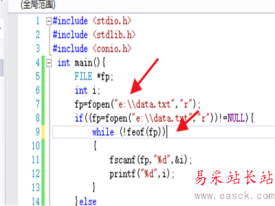 3、第三然后創(chuàng)建指針fp和變量i。再用fp讀取文本文件。