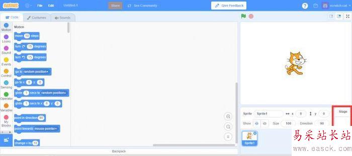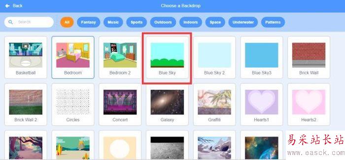 找到界面右下方【Stage】區域,點擊【backdrops】,選擇 blue sky,如下圖