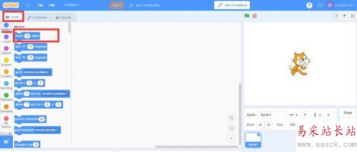在界面左邊積木區,點擊 【Code】選項卡,點擊 【Motion】,