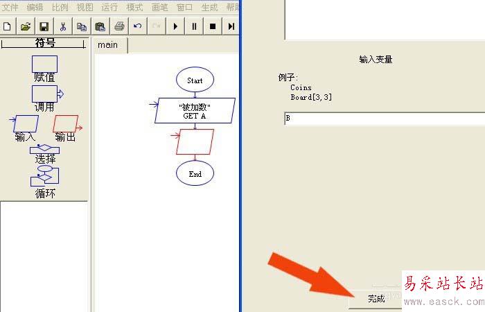5、左鍵單擊【賦值】圖形,并拖動到流程圖加數的后面,作為加法運算。然后,在畫流程圖的工具窗口中,鼠標左鍵單擊【賦值】圖形,并拖動到流程圖加數的后面,作為加法運算。雙擊【賦值】圖形,輸入加法運算式,并單擊【完成】按鈕,如下圖所示。