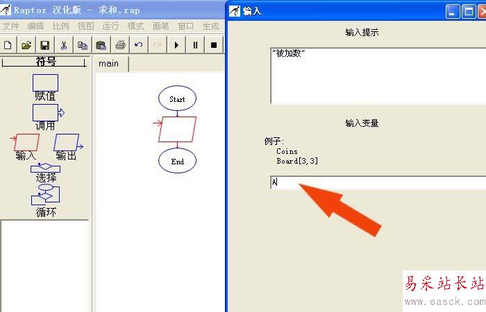 3、左鍵單擊【輸入】圖形,并拖動到流程圖中間位置處,作為被加數。然后,在畫流程圖的工具窗口中,鼠標左鍵單擊【輸入】圖形,并拖動到流程圖開始和結束的中間位置處,雙擊【輸入】圖形,在提示窗口上輸入被加數和變量名稱,并單擊【完成】按鈕,如下圖所示。