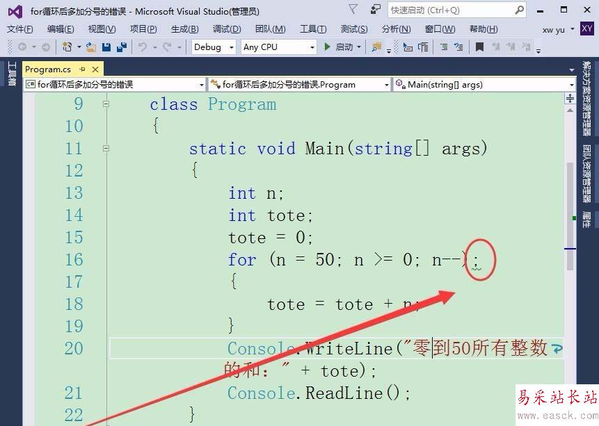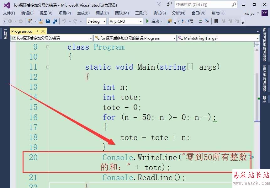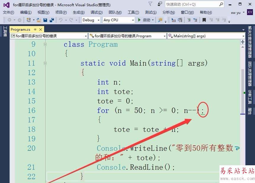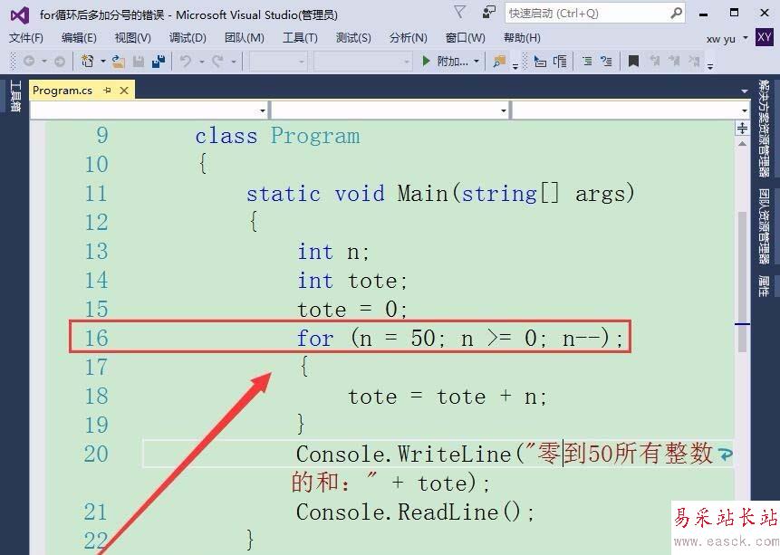 1、如果在for循環后,添加一個分號會有什么樣的錯誤呢?首先,定義一個整型變量n和tote,保存各整數以及總和。