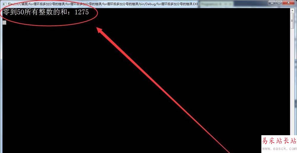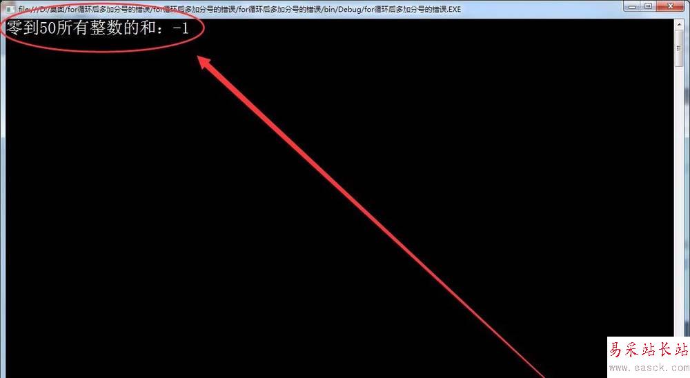 7、運行程序,在窗口中輸出的值卻是-1,這是什么原因呢?原因就在for語句后加的分號,由于在for語句后加了分號,使for語句執行的循環成為空循環,即for語句執行了51次空循環,最后一次循環中n的值變為-1,才執行累加,所以計算出的總和為-1。