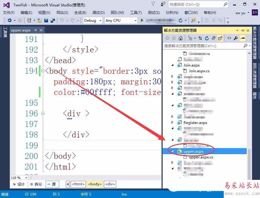 1、用Visual Studio打開一個已有動態(tài)網(wǎng)頁,本例為upper.aspx網(wǎng)頁文件。
