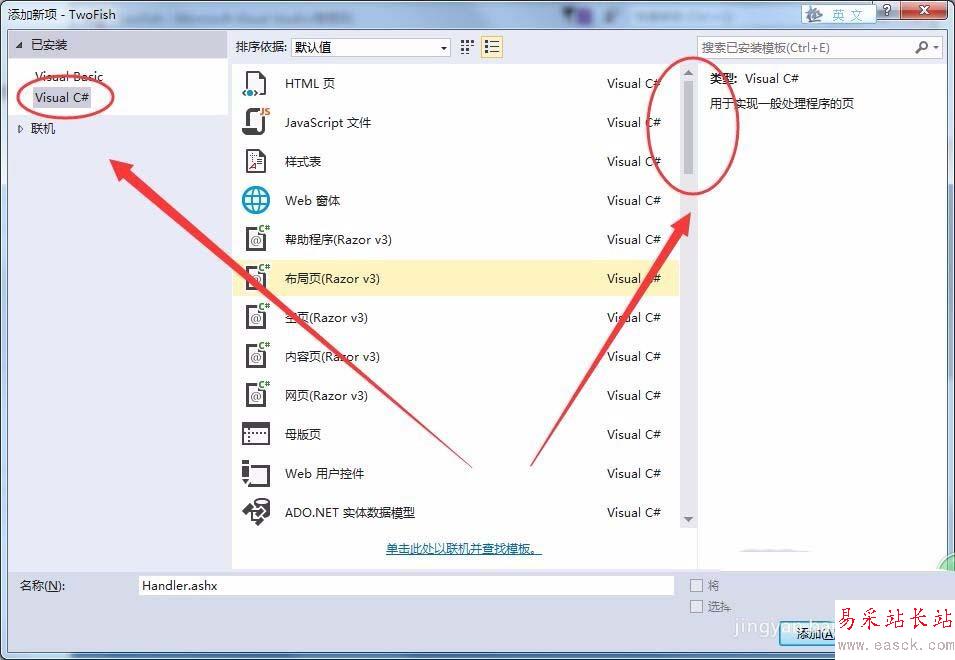 5、列表中選擇一般處理程序選項,將名稱改為User.ashx,單擊添加。