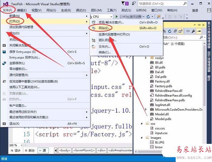 1、在Visual Studio窗口中,選擇文件---->打開---->網站,打開一個已有的網站,本例為TwoFish。