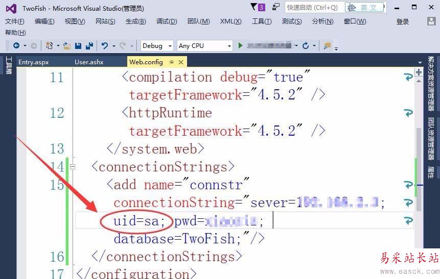 7、配置代碼中的uid,表示連接的SQL Server數據庫的名稱,本例為sa。