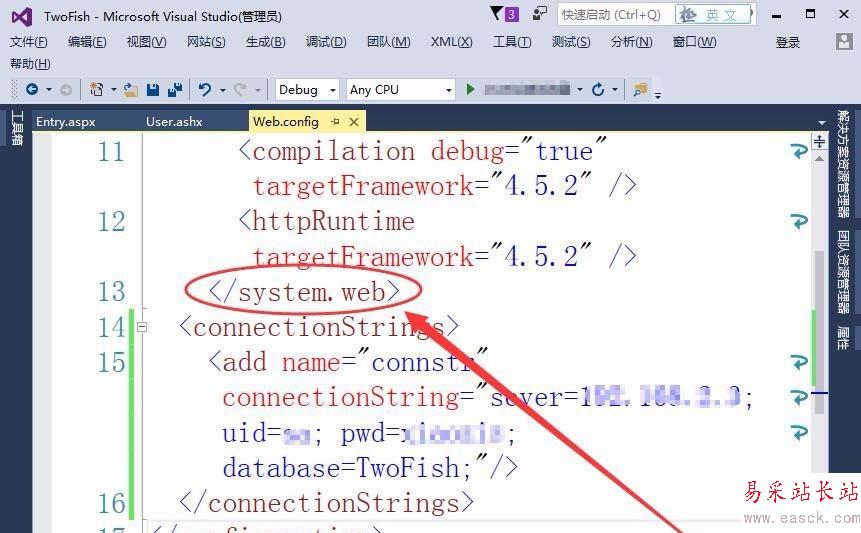 4、首先,輸入connectionStrings標簽,用來輸入配置數據庫連接的代碼。