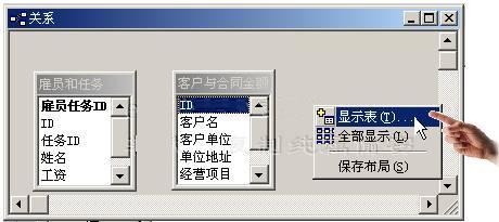 如果需要添加的關系表沒有在“關系”對話框中列出,那么就需要進入“顯示表”對話框,為此可以右擊“關系”對話框中任意處,然后從一份快捷菜單中選擇“顯示表”命令,參圖41。接下來就可以在這個對話框的“表”選項卡中選擇要加入的表,然后單擊“添加”按鈕。下面的操作將使用“雇員和任務”、“客戶與銷售量”、“客戶與合同金額”這三張數據表,它們全都是在此之前建立的,所輸入的數據記錄也很簡單,各字段如圖42所示,您可以自己建立好。