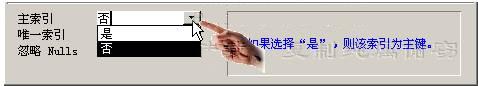 步驟六、若要使用多個索引,而且重新定義“主鍵”的話,單擊“索引”對話框的左下部的“主索引”下拉按鈕,然后從圖38所示的下拉列表中選擇“主索引”。