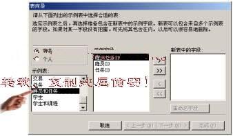 圖21 選定這張示例表 在余下操作中,您除了不能預覽新建的表外,所有的操作都可以參照中文visual foxpro 6來完成。在最后一步操作中,若使用中文access 2000的默認設置,那么單擊“完成”按鈕后,屏幕上就將顯示“雇員和任務:表”窗口,如圖22所示。此時,您就可以為此表輸入數據數據記錄了。輸入好了數據記錄,關閉此窗口,一張新的數據表就建立好了。當然了,您也可以不輸入任何數據記錄,將這個工作留待以后來做!