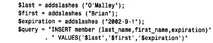 這里的問題是引用值的本身還包含著引號(“o’m a l l e y”),如果將查詢發(fā)送到mysql服務器會導致語法錯誤。在c 中我們調用mysql_escape_string() 解決這個問題。在perl dbi腳本中則使用quote( ) 。php 有一個addslashes( ) 函數可以完成同樣的事情。例如,調用a d d s l a s h e s(“o’ malley”)返回“o’ malley” 值。將前面的實例做如下編寫來解決引用問題: