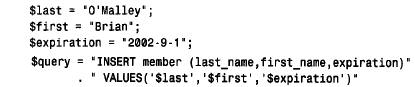 在php 中構造查詢字符串時,知道引用問題是必要的,就像在c 和perl 中一樣。雖然函數名在各種語言中是不同的,但處理引用問題的方法卻是類似的。假設正在構造一個,將新的記錄插入到表中的查詢,可以在值的前后加上引號插入到字符串列中: