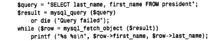 第三個提取行的函數mysql_ f e t c h _ o b j e c t ( ),返回結果集的下一行作為對象,這意味著用$row->col_name 語法訪問行的元素。例如,如果從president 表中檢索last_name 和first_name 值,可以用$row->last_name 和$row->first_name 訪問那些列: