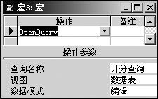 查看總分窗口只包括兩個按鈕,如圖4。建立過程如下:單擊【新建】按鈕,在打開的對話框中直接單擊【確定】,然后單擊窗口工具欄中的【標簽】按鈕,在窗體空白處拖出一個矩形,在矩形中輸入“計算分數”,最后按回車鍵結束(當然也可設置字號、字體及顏色)。右鍵單擊剛才建立的“計算分數”,在快捷菜單中選擇【事件生成器】,打開【選擇生成器】對話框,選擇【宏生成器】,再單擊【確定】,打開圖5所示宏編輯器(同時另存為對話框,采用默認的宏名,單擊【確定】即可)。在【操作】下面的第一個單元格中單擊,再單擊單元格中右邊的向下箭頭,從下拉列表中選擇“openquery”,在【查詢名稱】右邊的單元格中選擇“計分查詢”,最后保存退出。再建立“顯示總分”按鈕,建立過程與建立“計算分數”過程相似,也需建立一個宏,宏操作選擇“openform”,在宏編輯窗口中的【窗體名稱】單元格中選擇“顯示總分”窗口。