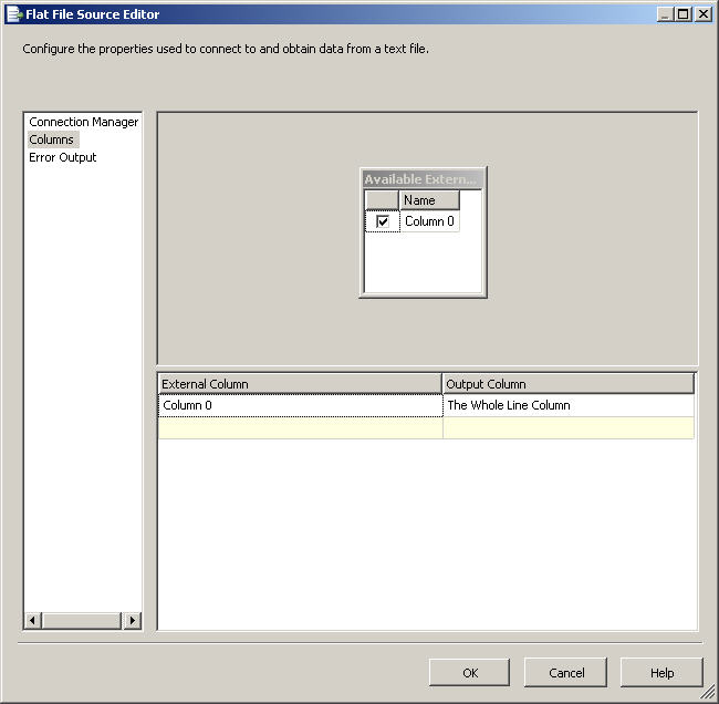 我們將建立一個flat file connection manager指向該文件,在這里,我并不打算把行拆分出來,暫時把整行讀在一列中