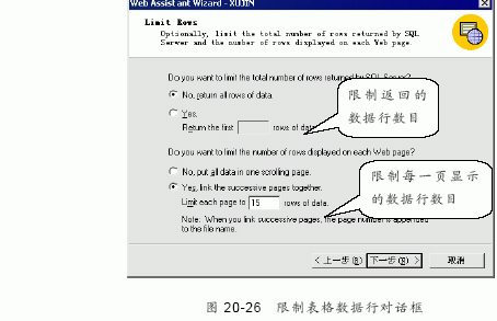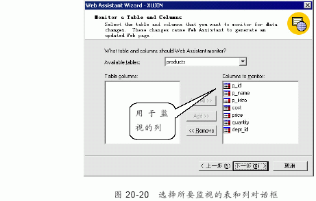 (5) 單擊"下一步"按鈕.如果選擇“data from the tables and columns that i select” 方式,對指定的單個表的列進行查詢,則出現(xiàn)如圖20-13 所示的選擇要查詢數(shù)據(jù)的表和列對話框。單擊“下一步”按鈕,則會出現(xiàn)如圖20-14 所示的指定數(shù)據(jù)查詢的行限制對話框,可以限制返回的數(shù)據(jù)。