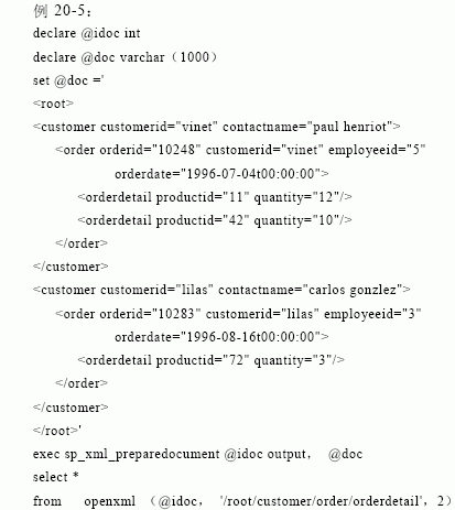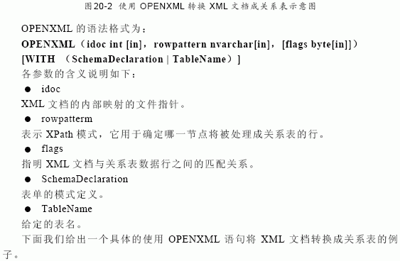 openxml 是一個行集提供者,與表和視圖極為相似。通過openxml 提取xml 文檔數據與讀取關系型行結果集數據一樣簡單、高效。在使用openxml 前必須首先調用sp_xml_preparedocument 系統過程,其主要作用是解析xml 文檔,并返回該文檔的文件指針。然后該文件指針傳給openxml, 其根據傳來的參數將xml 文檔轉換成行結果集。最后通過調用sp_xml_removedocument 系統過程來釋放由 xml 文檔所占用的內存空間。其具體執行過程請參看圖20-2。