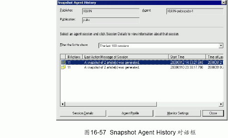在sql server 中,復(fù)制是功能最為強(qiáng)大而又最為復(fù)雜的組件,所以在具體的應(yīng)用中復(fù)制出現(xiàn)錯誤是難以避免的事情。但同時令人欣慰的是,sql server 提供了復(fù)制管理工具——復(fù)制監(jiān)視器來幫助dba 查出復(fù)制錯誤發(fā)生的原因。利用復(fù)制監(jiān)視器可以: 瀏覽所有的出版者出版物以及由該分發(fā)者所支持的訂購; 瀏覽復(fù)制代理的狀態(tài)信息和歷史; 監(jiān)視與復(fù)制事務(wù)有關(guān)的復(fù)制警報。 同時利用復(fù)制監(jiān)視器可約嗍涌煺沾懟⑷罩駒畝鏈懟⒎址⒋懟⒑喜⒋懟?br> 注意:只有在服務(wù)器扮演分發(fā)者角色,且當(dāng)前用戶具有sysadmin角色時,復(fù)制臨視器才能激活。 如果準(zhǔn)備監(jiān)視快照代理的活動狀況,請執(zhí)行以下步驟; (1) 啟動sql server enterprise manager, 登錄到指定的服務(wù)器,順次打開 replication monitor, agents 文件夾。 (2) 選中snapshot agents, 此時在右面窗格中顯示已創(chuàng)建的快照代理。 (3) 右擊準(zhǔn)備查看的代理,在彈出菜單中選擇agent history 選項,打開snapshot agent history 對話框,如圖16-57 所示; (4) 單擊session details 按鈕,打開session details of snapshot agents 對話框,如圖16-58 所示。在該對話框中能了解到目前為止快照代理都執(zhí)行了哪些處理、運(yùn)行的起始時間等信息。