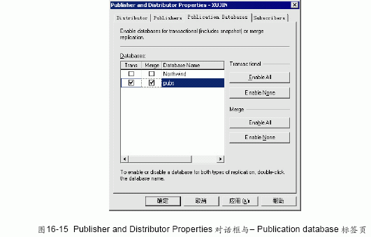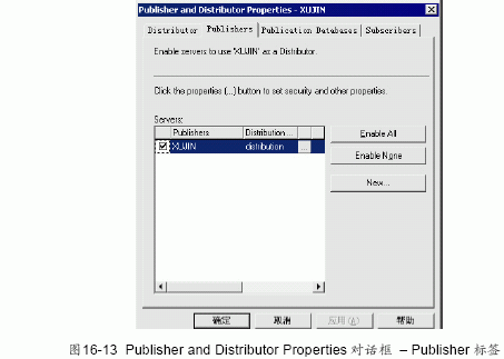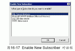 如果分發者上有多個分發數據庫,則應為出版者選擇一個分發數據庫。在snapshot folder 設置出版物快照文件存放的位置。如果對于出版者來說,該分發者是遠程的,則必須保證運行在出版者上的快照代理具有訪問分發者快照文件的權限。 若分發者服務器運行在nt 平臺上,在默認情況下,快照文件存儲路徑為//<computer>/<driver>/microsoft sql server/mssql/repldata。 若分發者服務器運行在window95/98 下,則快照文件的存儲路徑為//<computer>/<driver>/microsoft sql server/mssql/repldata。 如果采用拉訂購模式,則快照文件必須存儲成網絡路徑格式。這樣運行在訂購者和出版者上的復制代理才能正確地訪問快照文件。 3 配置出版數據庫 在為出版者指定分發數據庫之后還需要設定用于出版的數據庫,然后才能在出版數據庫上創建出版物。設定一個用于出版的數據庫需要執行以下步驟: (1) 啟動sql server enterprise manager, 選中分發者服務器。 (2) 在主菜單中選擇tools, 在下拉菜單中選擇replication, 然后選擇configure publishing, subscribers and distribution 選項,此時會打開publisher and distributorproperties 對話框,選中publication database 標簽。如圖16-15 所示。 (3) 在database 下的表格內單擊trans 或merge 列下的復選框來設定出版數據庫是用于事務復制還是合并復制。 當然也可以通過復選框來禁止某一數據庫來出版出版物。如果某一出版數據庫被禁止出版,那么在該數據庫中已創建的出版物將被刪除掉。 4 配置訂購選項 當設置完分發數據庫選項和出版活動選項后,就必須設置訂購者,以讓其知道從哪里接收復制數據。使用sql server enterprise manager 使上一個遠程服務器扮演訂購者角色需執行以下步驟來進行選項配置: (1) 啟動sql server enterprise manager, 選中分發者服務器。 (2) 在主菜單中選擇tools, 在下拉菜單中選擇replication, 然后選擇configure publishing, subscribers and distribution 選項,此時會打開publisher and distributor properties 對話框,選中標簽 。如圖16-16 所示; (3) 在subscribers 下的表格中單擊復選框來指定某一遠程服務器扮演訂購者角色。 (4) 單擊enable all, 則表格中所列出的所有服務器都作為訂購者從出版者接收復制數據;單擊enable none, 則禁止表格中服務器從出版者接收復制數據;單擊new 表示添加新的訂購者,將打開 enable new subscriber 對話框。如圖 16-17 所示。 添加新的訂購者時,可以添加sql server 訂購者,也可以添加異構訂購者。sql server 支持三種異構訂購者,它們是: sql server database microsoft access odbc 數據源 ole db 數據源