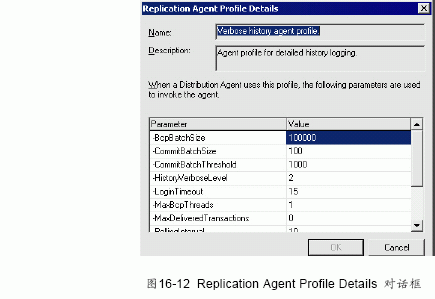 1 配置分發選項 利用sql server enterprise manager 執行配置分發選項的步驟為: (1) 啟動sql server enterprise manager, 選中要進行分發選項配置的分發者服務器。 (3) 單擊標簽頁上的“new”, 按鈕將添加新的分發數據庫,或使用“delete” 從 distribution database 選項欄的database 框中選中刪除一個已存在的分發數據庫,若要對分發數據庫進行屬性設置,則首先選中該分發數據庫,然后單擊 properties 按鈕,打開distribution properties 對話框,如圖16-10 所示。 該對話框提供了以下信息:分發數據庫名稱;在publishers 下的多行編輯框內顯示使用該分發數據庫的出版者;transaction retention 用來設定事務保存在分發數據庫中最短時間與最長時間(該選項對于備份和恢復分發數據庫很有意義);history retention 用來設定復制性能歷史記錄的保存在分發數據庫的時間。如果選用的單位為小時,則保存時間的取值范圍為0 至9999 ;如果單位為天,則取值范圍為0 至416。 (4) 單擊agent profiles 選項欄中的agent profile 按鈕,打開agent profile for “server_name” 對話框,如圖16-11 所示。 該對話框用來對復制代理快照(代理日志、閱讀代理、分發代理、合并代理、閱讀日志代理)運行參數進行設置。當創建復制代理時,將生成與其相關的agent profile, 它由分發者維護。復制代理每次啟動時都要從agent profile 中讀取信息,來確定自己的運行方式。通過copy 按鈕,可以創建新的agent profile; 通過 view details 可以查看或修改各參數的值,如圖16-12 所示;通過 delete 可以刪除agent profile。 2 配置出版選項 在配置完分發選項后,就可以配置出版選項來指定哪個出版者將使用已創建的分發者和分發數據庫。sql server 允許多個出版者使用同一個分發數據庫。如果出版者是一臺遠程服務器,那么它必須有訪問分發數據庫的權限。使用sql server enterprise manager 來允許出版者使用分發數據庫的步驟如下: (1) 啟動sql server enterprise manager, 選中分發者服務器。 (2) 在主菜單中選擇tools, 在下拉菜單中選擇replication, 然后選擇configure publishing, subscribers and distribution 選項,此時會打開publisher and distributor properties 對話框,選中publisher 標簽。如圖16-13 所示。 (3) 通過選中server 表格內的空白框來指定該出版者是否使用當前分發數據庫。 (4) 單擊分發數據庫旁的方框按鈕,打開如圖16-14 所示的出版者屬性設置對話框。進行其它選項的設置。