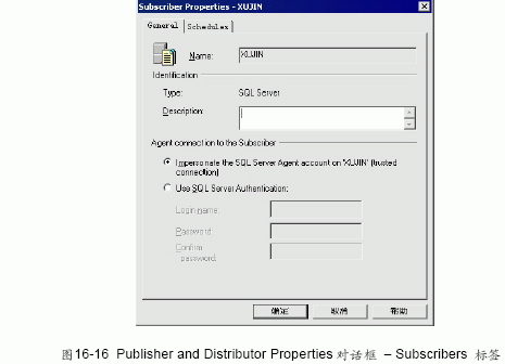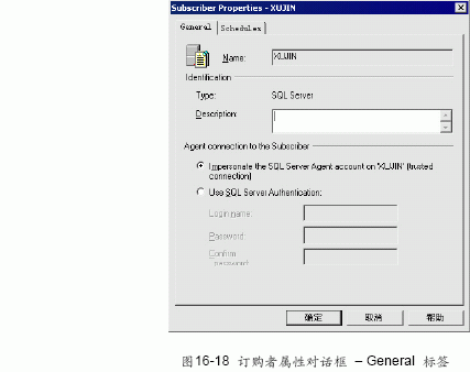在使用異構訂購者前必須首先創建相應的數據源。不同的非sql server 數據源有不同的創建要求和限制,比如,是否包含用戶名,對數據類型的支持范圍不同。另外,還應注意以下幾點: 在通常情況下非sql server odbc 數據源只能作為訂購者;快照復制和事務復制適用于所有非sql server 訂購者;異構訂購者只能使用推訂購的方式。 (5) 如果并不打算添加新的訂購者,則不必執行step4。 通過單擊表格中訂購者右邊的方框按鈕可打開訂購者屬性對話框,對其它屬性項進行設置。如圖16-18 所示。 在該對話框內顯示訂購的類型(sql server odbc ole db), 以及關于訂購的描述信息。在agent connection to subscriber 下的選項欄中,通過選中單選按鈕設置復制代理日志寫入訂購者時的安全認證模式和設置。如果選擇impersonate the sql server agent account on ‘xujin’ (trusted connection)選項,則表示利用出版者上sql server agent 賬號來進行認證,默認情況下使用該設置。use sql server authentication 表示使用sql server 認證模式,此時要求通過輸入賬號和密碼來建立一個信任連接。