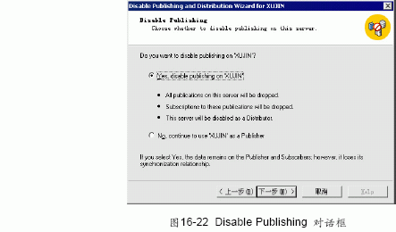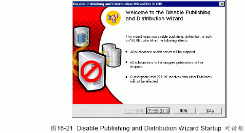 如果此向導能登錄到出版者,則在禁用出版者之前會刪除所有出版物;如果不能,則雖然禁用出版者但是出版數據仍存在于以前的出版者上,必須使用手工操作來刪除。 使用sql server enterprise manager 來禁用一服務器扮演分發者角色需執行以下步驟: (1) 啟動sql server enterprise manager, 選中分發者服務器。 (2) 在主菜單中選擇tools, 在下拉菜單中選擇replication, 然后選擇disable publishing…. 選項,此時會打開disable publishing and distribution wizard startup 對話框,如圖16-21 所示,從中可以看到該向導能夠實現哪些功能。 (3) 單擊“下一步”按鈕,打開disable publishing 對話框。如圖16-22 所示。在該對話框內如果選擇yes, disable publishing on…..選項,則會禁用分發者以及出版者,并且刪除分發數據庫和出版者上的出版物(在有些情況下仍保留分發數據庫)。單擊“下一步”按鈕,sql server 將按要求執行相關處理。如果選擇no, continue to use “distributor” as a distributor 選項,則不會進行任何處理。 (4) 單擊“下一步”按鈕,sql server 將按要求執行相關處理,同時彈出一個進行對話框,如圖16-23 所示。 (5) 通過單擊“cancel” 可以取消操作,單擊“finish”, 完成整個向導。