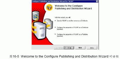 16.2.1 創建服務器角色和分發數據庫 創建服務器角色是指在復制過程中某一服務器是作為出版者、分發者還是作為訂購者s捎赟ql server 可以扮演一個或多個角色,所以我們必須指定由哪個服務器來扮演哪些角色。 分發數據庫(distribution database) 用來存儲復制給訂購者的所有事務以及出版者與訂購者的同步信息。在分發數據庫有很多與復制有關的系統表。進行復制前必須首先創建分發數據庫(與系統有關的系統表會自動生成),同時指定出版者、出版數據庫、分發者、訂購者。使用sql server enterprise manager 來創建分發數據庫主要按以下步驟: (1) 啟動sql server enterprise manager, 選中準備扮演出版者角色的服務器。 (2) 在主菜單上選擇tools 菜單項在下拉菜單中再選擇replication 選項,選中configure publishing, subscribers, and distribution 選項,此時會彈出welcome to the configure publishing and distribution wizard 對話框。如圖16-5 所示。 (3) 從中可以得知通過該向導能夠實現哪些復制配置,單擊“下一步”繼續操作,此時彈出select distributor 對話框。如圖16-6 所示。 在該對話框中可以使用默認選項make ‘xujin’ its own distributor; sql server will create a distribution database and log 來指定當前出版者服務器扮演分發者角色,若選擇此選項,則會在分發者服務器上創建一個分發數據庫和日志。如果選擇另外一個選項,應該注意被選定的服務器必須已被配置為分發者且已經創建了分發數據庫。在此使用默認選項, (4) 單擊“下一步”,此時彈出configure sql server agent 對話框。如圖16-7 所示。選擇yes 選項表示自動啟動sql server agent, 選擇no 選項,則表示手工啟動sql server agent。 (5) 單擊“下一步”,彈出customize the configuration 對話框。在該對話框內如果選擇默認的選項。即no, use the following default setting ,那么sql server 將自動配置復制選項,它將把當前服務器作為分發者,分發數據庫和事務日志被放在/mssql/data 目錄下,所有登記的服務器都被選為訂購者。您也可以選擇自定義選項,即yes, let’s…. 選項來對分發者、出版者、訂購者、分發數據庫進行配置(我們將在下一節對其進行具體的介紹)。在這里我們選擇默認選項。 (6) 單擊“下一步”,然后在打開窗口(如圖16-8 所示)中單擊“finish” 按鈕,此時會彈出一個報告窗口configure publishing and distribution on ‘server _name’ 來顯示創建進度。通過該窗口能了解sql server 完成了哪些工作。