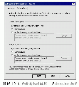 (6)選中schedules標簽,出現如圖16-19所示的對話框。 使用該對話框來設置分發代理或合并代理運行的缺省時間。在默認情況下為continuously。若選擇at the following scheduled times,則單擊change按鈕會打開edit recurring job schedule對話框。如圖16-20所示。在該對話框可對代理運行的時候表進行設置。
