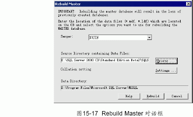 增加或刪除用戶數據庫。但是如果增加或刪除文件或文件組,或用戶數據庫自動增加來容納新添加的數據,這些操作并不對master 數據庫產生影響,所以此時不必對其進行備份; 創建新的登錄或執行與登錄有關的操作,但是增加數據庫用戶并不影響master 數據庫; 創建或刪除備份設備; 為了進行分布式查詢或遠程過程調用而對數據庫服務器進行配置,如增加連接服務器或遠程登錄等。 對master 數據庫,我們常進行完全數據庫備份。而恢復master 數據庫,卻有兩種途徑:或是使用master 數據庫當前備份,或是執行rebuild master utility 來重建master 數據庫。如果master 數據庫遭到的損壞還不足以使sql server 無法啟動,我們可以使用master 數據庫的當前備份來執行恢復;如果master 遭到嚴重破壞,sql server 無法啟動,或者master 數據庫的當前備份也不能使用,我們則必須執行rebuild master utility 來重建master 數據庫(此時master 數據庫中的所有以前的數據都將丟失),然后再使用備份來進行恢復(如果master 的備份可以使用)。 使用rebuild master utility 來重建master 主要執行以下步驟: (1) 關掉sql server, 然后運行位于/ microsoft sql server/80/tools/binn 下的rebuildem.exe 文件,出現rebuild master 對話框。如圖15-17 所示。 (2)單擊browse 按鈕來瀏覽包括data 文件的源目錄。 (3)單擊setting 按鈕出現collation setting 對話框,如圖15-18 所示。 (4)單擊rebuild 按鈕重建master 數據庫。 重建master 數據庫只是整個恢復工作的開始,然后要裝入master 數據庫的備份。如果備份不可用,則要重新創建任何必要的備份設備,接著恢復msdb model distribution 數據庫以及用戶數據庫。對于那些在master 數據庫最近的備份后所創建的數據庫來說,如果其存在備份,則使用備份進行恢復,如果不存在,只能通過重新連接數據庫文件(數據和日志文件)來重新恢復數據庫。 在sql server 中,我們可以拆開數據庫的數據文件和事務日志文件,然后將它們重新連接到另外的服務器或同一個服務器。拆開數據庫就是將數據庫從sql server 中刪除,但是保持數據和事務日志文件的完整性。然后事務日志和數據文件可在任何運行 sql server 的服務器上被重新連接成該數據庫。因此當您準備把數據庫從一臺機器移到另外的機器上但不重新創建數據庫,或者將數據庫移到另外的磁盤上您會發現數據庫的拆分和連接是很有用處的。