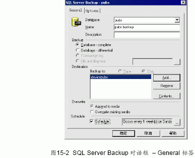 (9) 在database backup 對(duì)話框中選擇option 標(biāo)簽來(lái)進(jìn)行附加設(shè)置選擇option標(biāo)簽后的對(duì)話框如圖15-6 所示。
